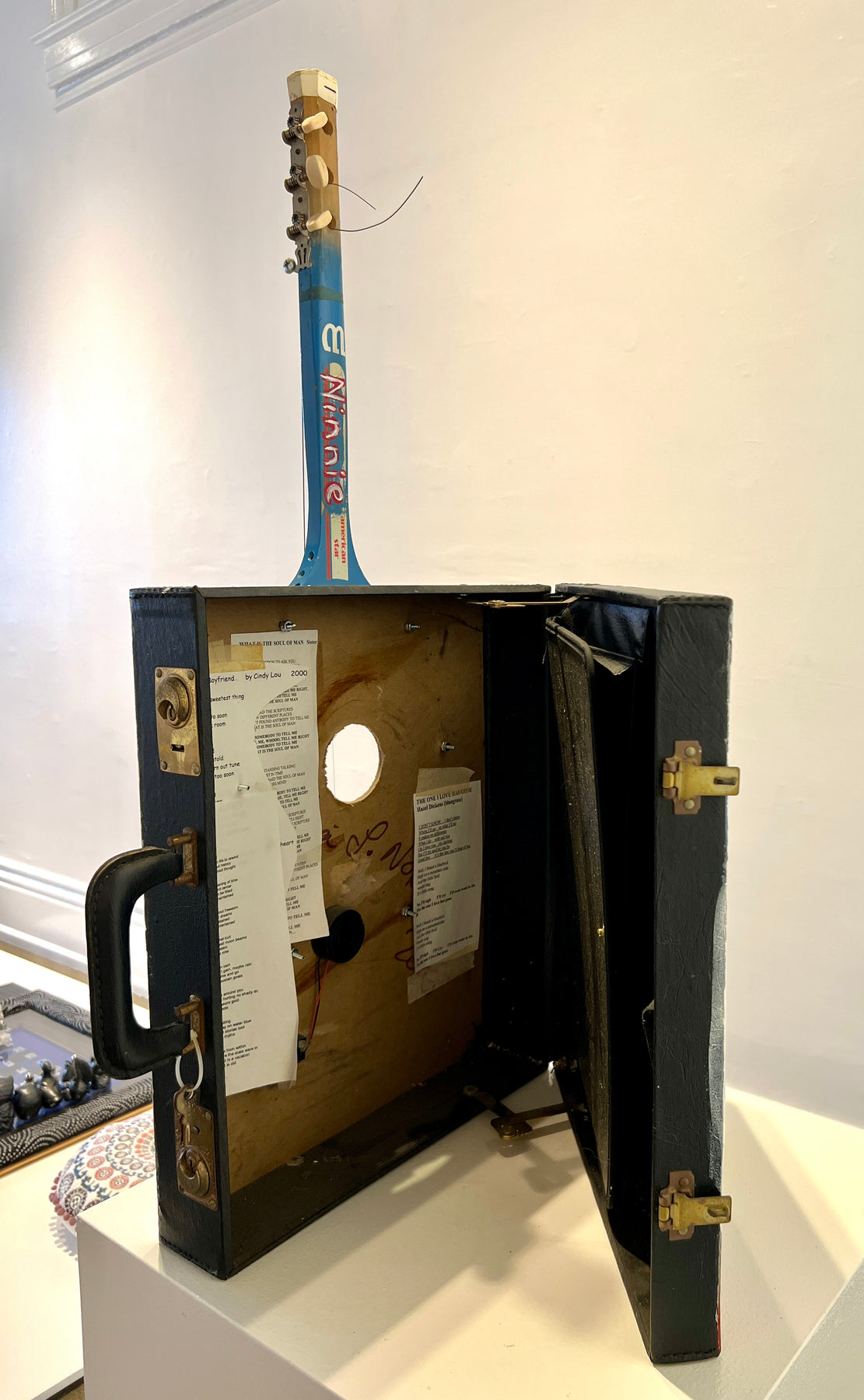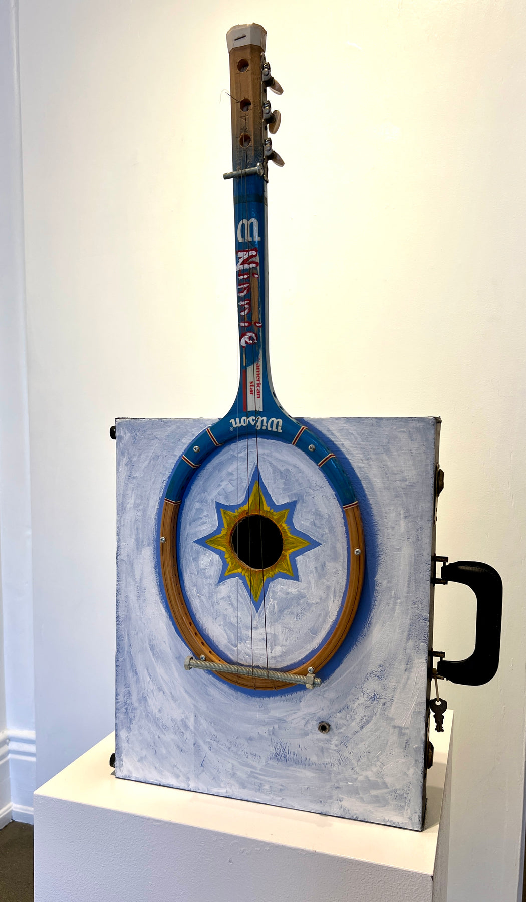 Oil on object, tennis racquet, tunning gears, strings, hardware, mic, residual song papers