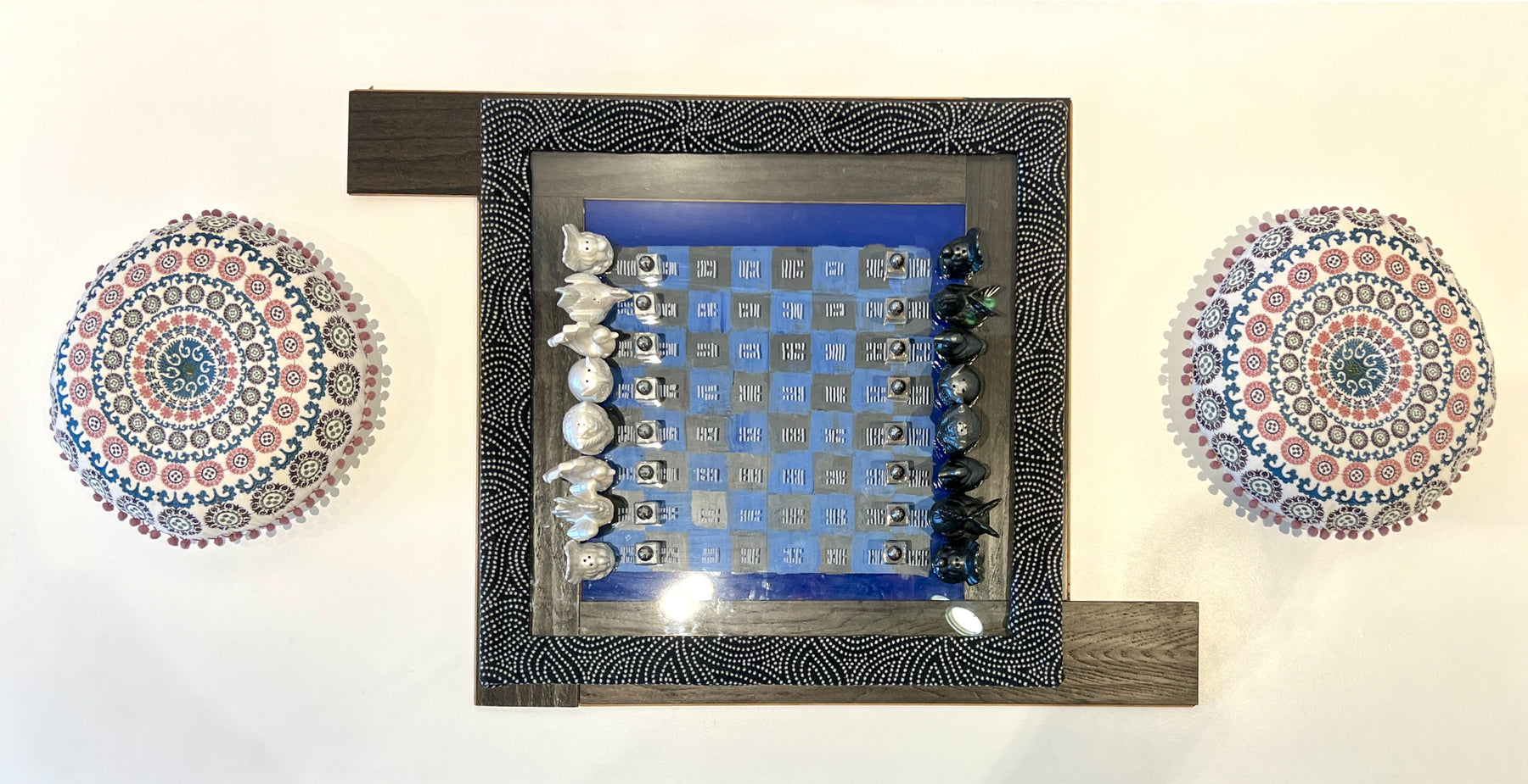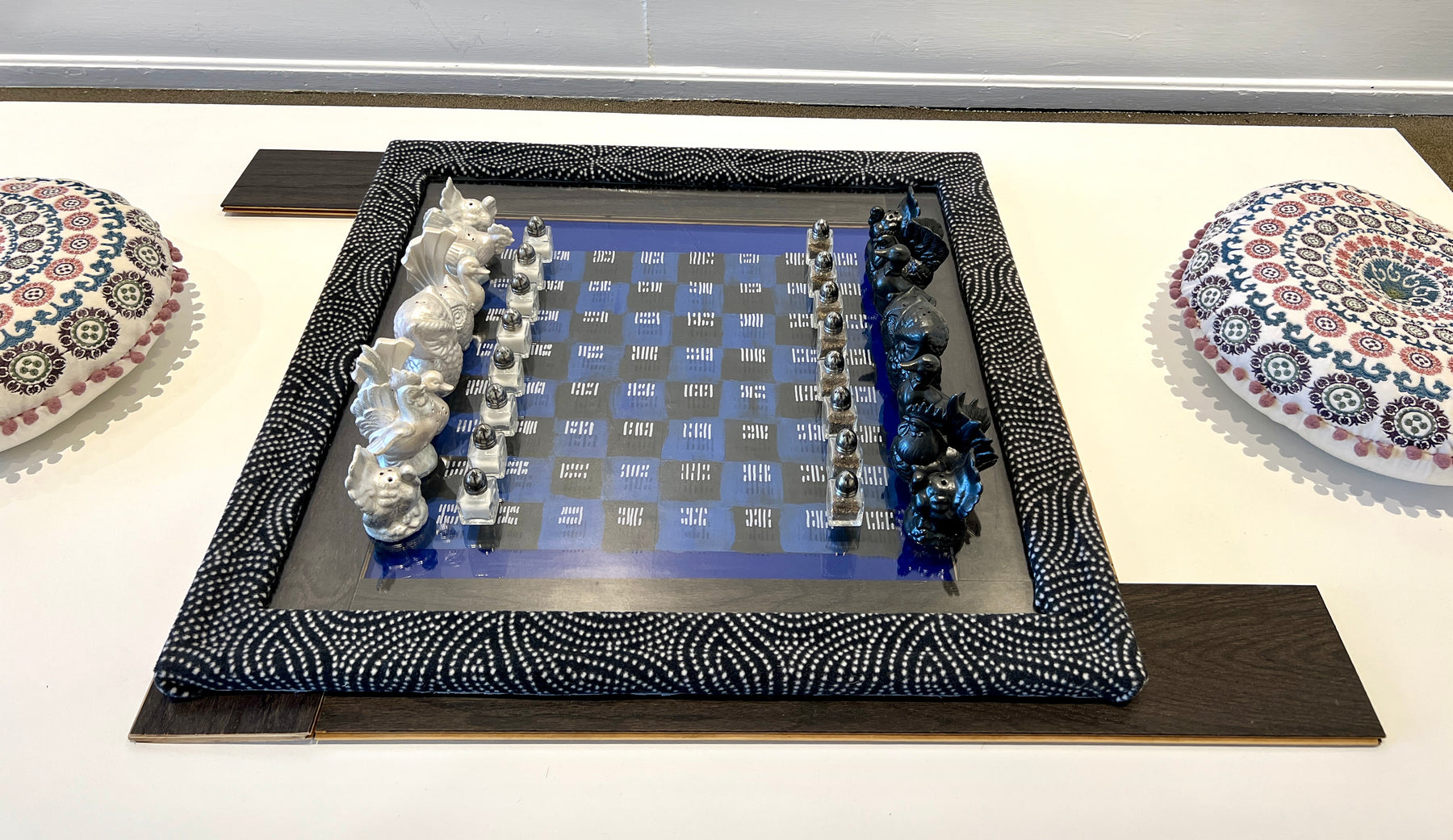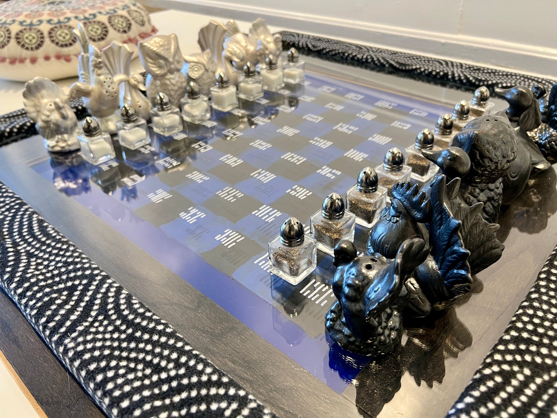 Salt & pepper shakers, picture frame, fabric, floor boards, pillows